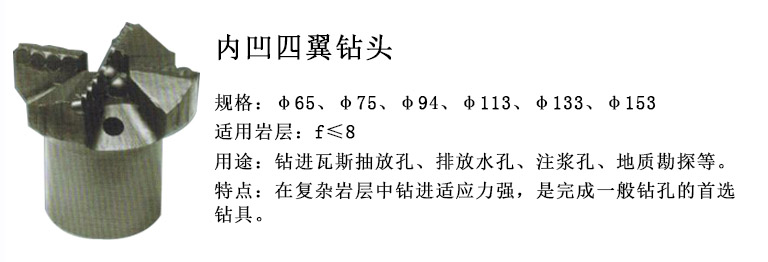金剛石復合片四翼鉆頭穩(wěn)定性好、適應性強、使用壽命長、鉆進中鉆整體巖層效率高、保徑效果好、適用范圍和具有優(yōu)越的性價比等特點,可廣泛應用于地質勘探、煤礦開采、水利水電施工、公路鐵路施工建設的巖石鉆進,鉆進瓦斯抽放孔、排放水孔、注漿孔、地質勘探等。