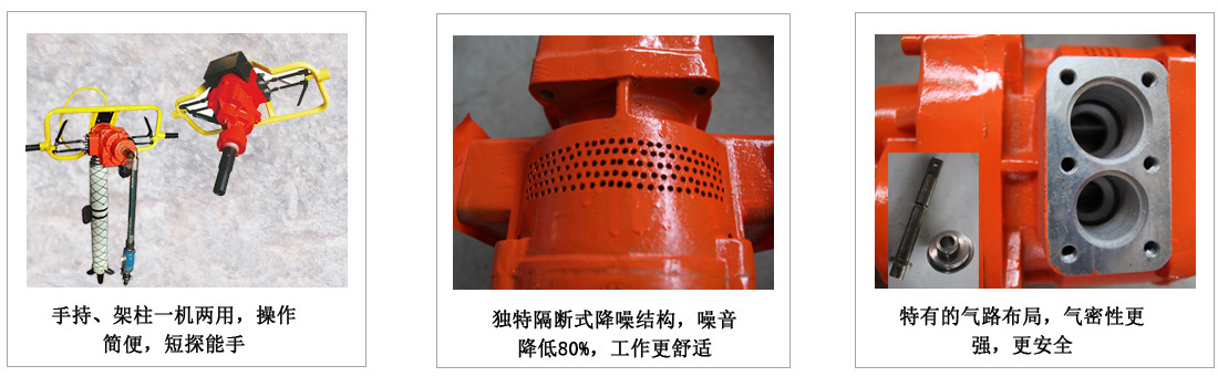 ZQSJ-140/4.1氣動手持式鉆機產(chǎn)品簡介 類別:氣動手持式鉆機 型號:ZQSJ-140/4.1 品牌:河北啟睿 用途:該氣動手持式鉆機為便攜式,它具有安全防爆、轉(zhuǎn)矩大、帶有反轉(zhuǎn)、 轉(zhuǎn)速高、質(zhì)量小、效率高、結(jié)構(gòu)簡單、維修方便等特點。因此本鉆機工作 效率高、支護(hù)質(zhì)量好、工人勞動強度低、進(jìn)尺費用少,所以它是煤礦行業(yè) 必備設(shè)備之一。該機主要用在探測地質(zhì)構(gòu)造煤層、探放水、瓦斯、煤層注 水、卸放壓力孔,巷道幫錨桿孔的鉆孔及描桿的攪拌和螺母的安裝。也可 用于巖巷樹脂錨桿的攪拌及螺母的安裝。