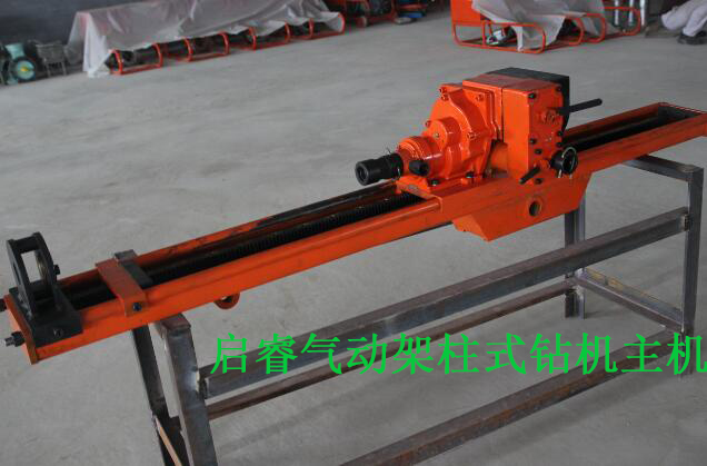 氣動(dòng)探水鉆機(jī)是架柱式型的,型號(hào)為ZQJC系列,按照扭矩從220N.m到1000N.m,型號(hào)有十多個(gè),氣動(dòng)架柱式鉆機(jī)有幾個(gè)特點(diǎn):全氣動(dòng),直接接坑道內(nèi)高壓空氣,不用電,隨時(shí)使用;該鉆機(jī)轉(zhuǎn)矩大、轉(zhuǎn)速高,比如啟睿ZQJC-380/7.3s氣動(dòng)架柱式鉆機(jī),轉(zhuǎn)矩380N.m,轉(zhuǎn)速185r/min,這是扭矩較小的氣動(dòng)架柱式鉆機(jī),該系列鉆機(jī)扭矩可達(dá)1000N.m,輸出功率達(dá)11.00KW;氣動(dòng)架柱式顯著特征是輕便,由于鉆機(jī)是風(fēng)動(dòng)的,整體結(jié)構(gòu)簡(jiǎn)單,加上啟睿鉆機(jī)緊湊性設(shè)計(jì),整機(jī)僅200kg,而且是分體、組裝簡(jiǎn)單,對(duì)于工作面廣、鉆機(jī)需要經(jīng)常移動(dòng)的煤礦再適合不過(guò)了。